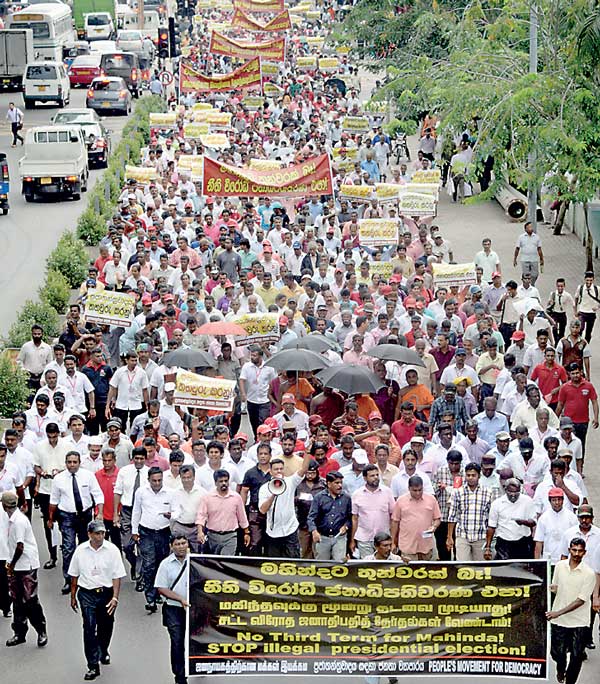 சிறிலங்கா அதிபர் மகிந்த ராஜபக்ச மூன்றாவது தடவையும் அதிபர் தேர்தலில் போட்டியிடுவதற்கு எதிராக கொழும்பில் நேற்று பாரிய பேரணி ஒன்று நடத்தப்பட்டது.