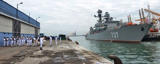 கொழும்புத் துறைமுகத்தில் ரஸ்யக் கடற்படைக் கப்பலுக்கு சிறிலங்கா கடற்படையினர் வரவேற்பு அளித்தனர்.