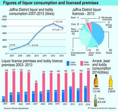 மதுவரித் திணைக்களத்தின் புள்ளிவிபரங்களின்படி, ஆறு இலட்சம் சனத்தொகையைக் கொண்ட யாழ்ப்பாணத்தில், கடந்த ஆண்டு 6 மில்லியன் லிட்டர் சாராயம் மற்றும் பியரும், 5 மில்லியன் லிட்டர் கள்ளும், நுகரப்பட்டுள்ளது.