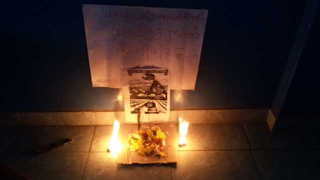 யாழ். பல்கலைக்கழகத்துக்கு வெளியேயும், உள்ளேயும், பெருமளவு சிறிலங்காப் படையினர் குவிக்கப்பட்டிருந்த நிலையிலும், மாவீரர்களுக்கு சுடர் ஏற்றி அஞ்சலி செலுத்தப்பட்டுள்ளது.