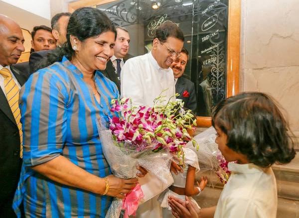 விமான நிலையத்தில், மைத்திரிபால சிறிசேனவை, தமிழ்நாட்டைச் சேர்ந்த மத்திய அமைச்சர் பொன்.இராதாகிருஸ்ணன் மற்றும் அதிகாரிகள் வரவேற்றனர்.