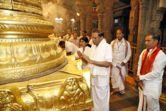 மைத்திரிபால சிறிசேனவும், அவரது மனைவி ஜெயந்தி புஸ்பகுமாரியும், சுப்ரபாத சேவையில் தரிசனம் செய்வதற்காக, தங்கக் கதவுகள் திறக்கப்படுவதற்காக ஏற்கனவே வைகுண்ட வளாகத்துக்கு முன்பாக உள்ள மகாத்துவாரம் பகுதியில் காத்துக் கொண்டிருந்தனர்.