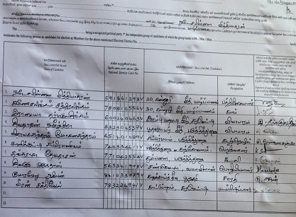 இன்று யாழ்.மாவட்டச் செயலகத்தில் வித்தியாதரன் தலைமையில் சென்ற சுயேச்சைக்குழு வேட்பாளர்கள் தேர்தல் அதிகாரியிடம் தமது வேட்புமனுவைக் கையளித்தனர்.