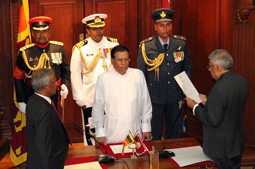 சிறிலங்கா அதிபர் செயலகத்தில் இன்று காலை 10.03 மணியளவில், ரணில் விக்கிரமசிங்க, சிறிலங்கா அதிபர் மைத்திரிபால சிறிசேன முன்பாக பதவியேற்றார்.