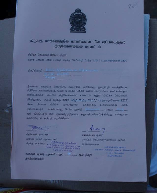 சம்பூரில், பொருளாதார வலயத்துக்காக சுவீகரிக்கப்பட்ட மற்றும் சிறிலங்கா கடற்படையினரால் சுவீகரிக்கப்பட்ட காணிகள், உயர்நீதிமன்ற உத்தரவுக்கமையவும், புதிய அரசாங்கத்தின் முடிவுக்கமையவும் மீளவும் பொதுமக்களிடமே வழங்கப்பட்டுள்ளன.