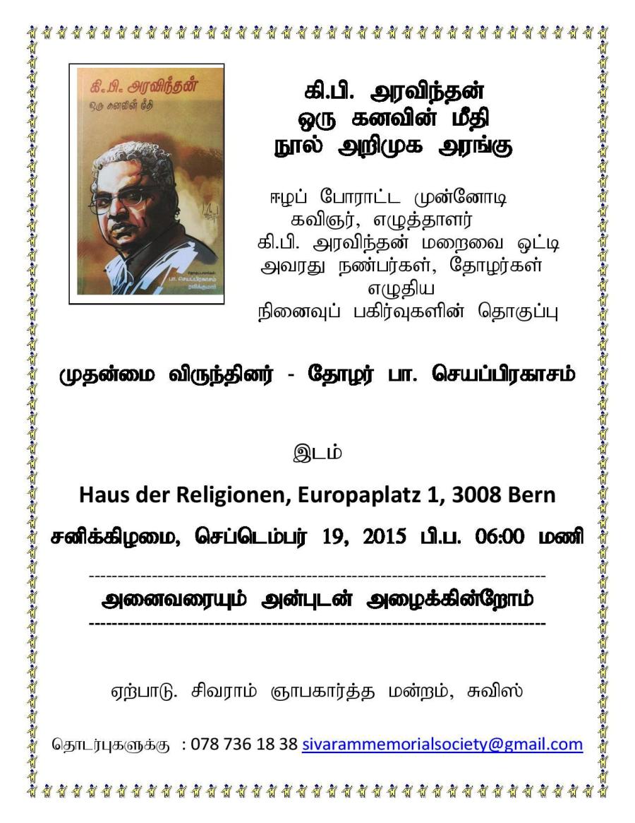 ஈழவிடுதலைப் போராட்ட முன்னோடியும், கவிஞரும், எழுத்தாளருமான, புதினப்பலகை நிறுவக ஆசிரியருமான- கி.பி.அரவிந்தன் அவர்களின் மறைவையொட்டி அவரது நண்பர்கள், தோழர்கள் எழுதிய நினைவுப் பகிர்வின் தொகுப்பான ‘ஒரு கனவின் மீதி’ நூல் அறிமுக அரங்கு சுவிசில் நடைபெறவுள்ளது.