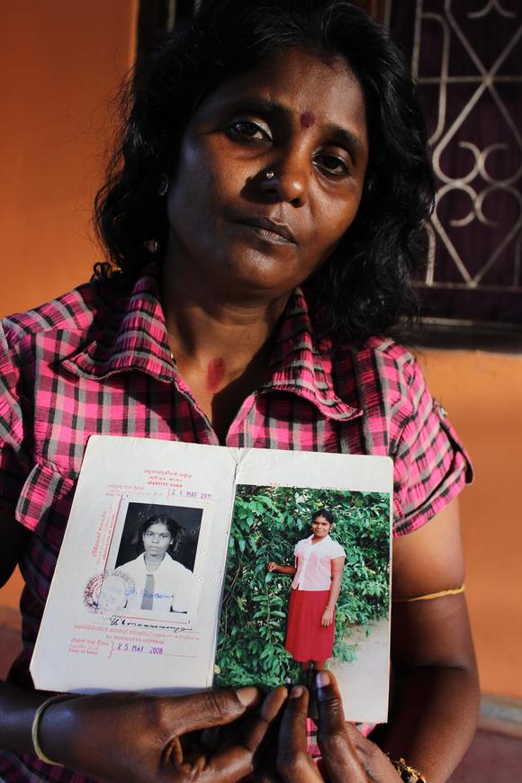 போர் முடிவடைவதற்கு சில வாரங்களுக்கு முன்னர் புலிகளால் படையில் இணைக்கப்பட்ட அப்போது 15 வயது நிரம்பிய தனது மகள் மேகலா போரின் இறுதியில் இராணுவத்திடம் சரணடைந்ததன் பின்னர் அவளுக்கு என்ன நடந்தது என்பதை அறியமுடியவில்லை என முள்ளிவாய்க்காலுக்கு அருகிலுள்ள கிராமம் ஒன்றில் வசிக்கும் கலாதேவி இராமாயம் கண்ணீருடன் தெரிவித்தார்.