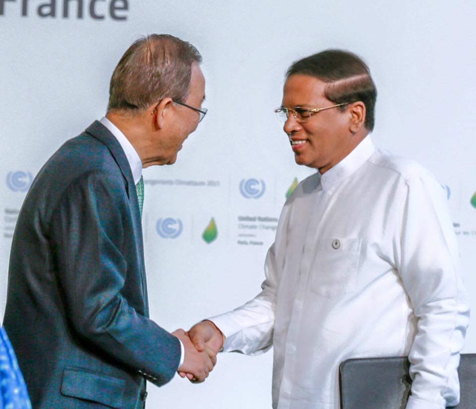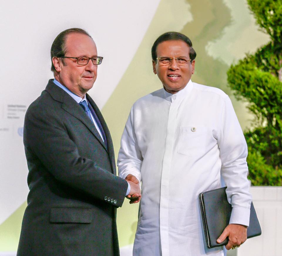 இந்த மாநாட்டில் இன்று பங்கேற்ற சிறிலங்கா அதிபரை, பிரான்ஸ் அதிபர் மற்றும் ஐ.நா பொதுச்செயலர் பான் கீ மூன் ஆகியோர் கைலாகு கொடுத்து வரவேற்றனர்.