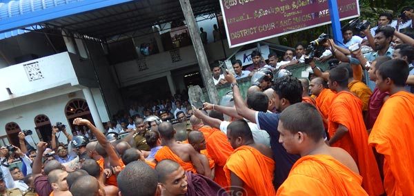 பிக்குகள் நீதிமன்றத்துக்கு வெளியே கூக்குரலிட்டு ஆர்ப்பாட்டம் செய்வதால், நீதிமன்ற கதவுகள் அனைத்தும் மூடப்பட்டுள்ளன.