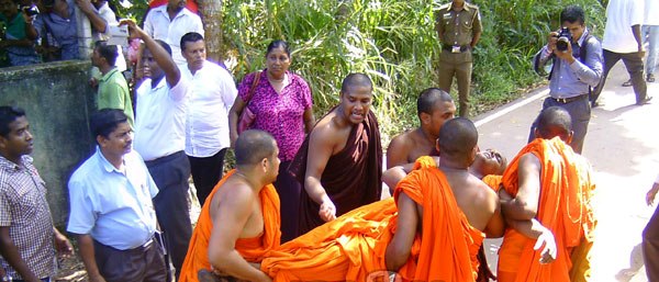 இதன் போது ஒரு பிக்கு சுவரில் இருந்து நீதிமன்றத்துக்குள் குதித்த போது காயமடைந்தார். அவர் ஏனைய பிக்குகளால் தூக்கிச் செல்லப்பட்டார்.
