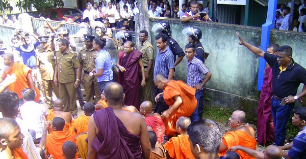 இதனால் ஹோமகம நீதிமன்றத்தில் பதற்றநிலை ஏற்பட்டது. இந்த நிலையில் மேலும் ஒரு தொகுதி பிக்குகள் அங்கு வந்து, தம்மையும் கைது செய்யுமாறு கோரி ஆர்ப்பாட்டம் செய்தனர்.