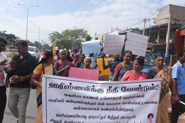 அதேவேளை, மாணவி ஹரிஸ்ணவிக்கு நடந்த கொடுமைக்கு நியாயம் வழங்கக் கோரி நேற்று வவுனியாவில் பாரிய ஆர்ப்பாட்டப் பேரணி மற்றும், வீதிமறிப்புப் போராட்டம் இடம்பெற்றது. இதில் பெருமளவு பொதுமக்கள், பங்கேற்றனர். மாணவர்களும் எதிர்ப்புப் போராட்டம் ஒன்றை நடத்தியிருந்தனர்.