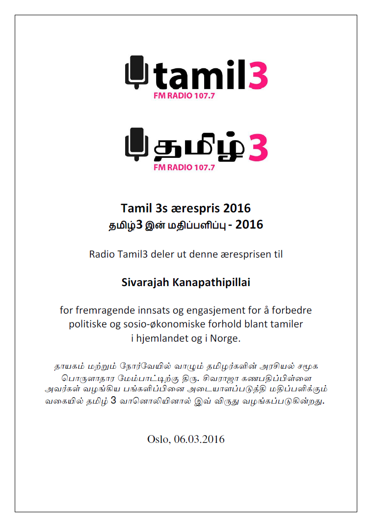 இந்தவாரம் தமிழ்3 தனது மூன்றாவது ஆண்டு நிறைவினைக் கொண்டாடிய‘சங்கமம் 2016’நிகழ்வின் போது மண்டபம் நிறைந்த மக்கள் முன்னிலையில் இந்த மதிப்பளிப்பு இடம்பெற்றது. ஓஸ்லோநகரில் வாழும் திரு. சிவராஜா அவர்களின் சகோதரி கமலராணி சேதார் அவர்கள் அரங்கத்தில் திரு.சிவராஜா அவர்களிற்குரிய விருதினைப் பெற்றுக்கொண்டார்.