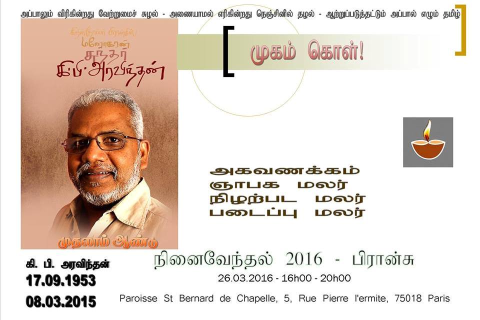 ஈழ விடுதலைப் போராட்ட முன்னோடிகளில் ஒருவரும், எழுத்தாளரும், சமூக அக்கறையாளரும், புதினப்பலகை நிறுவக ஆசிரியருமான மறைந்த கவிஞர் கி.பி.அரவிந்தன் (கிறிஸ்தோபர் பிரான்சிஸ்) அவர்களின் முதலாம் ஆண்டு நினைவேந்தல் நிகழ்வு வரும் சனிக்கிழமை, பிரான்ஸ் தலைநகர் பாரீசில் நடைபெறவுள்ளது.