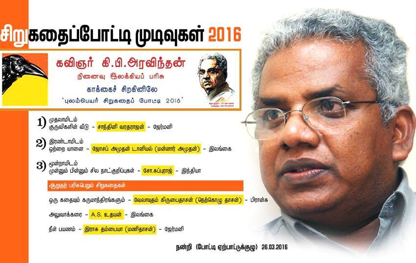 கவிஞர் கி.பி.அரவிந்தன் அவர்களின் நினைவாக “காக்கைச் சிறகினிலே” இதழ் குழுமத்தினரால் நடத்தப்பட்ட புலம்பெயர் சிறுகதைப் போட்டியின் முடிவுகள் அறிவிக்கப்பட்டுள்ளன.