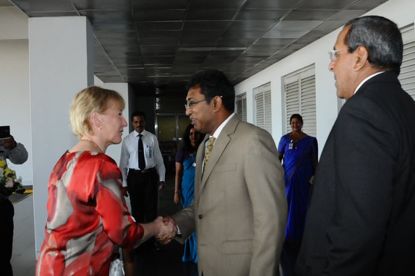 sweeden-fm-harsha (2)மூன்று நாள் பயணமாக சுவீடன் வெளிவிவகார அமைச்சர் மார்கொட் வோல்ஸ்ரோம் நேற்றுமாலை சிறிலங்கா வந்தடைந்தார். கட்டுநாயக்க விமான நிலையத்தில் அவரை, சிறிலங்காவின் பிரதி வெளிவிவகார அமைச்சர் ஹர்ஷ டி சில்வா வரவேற்றார்.
