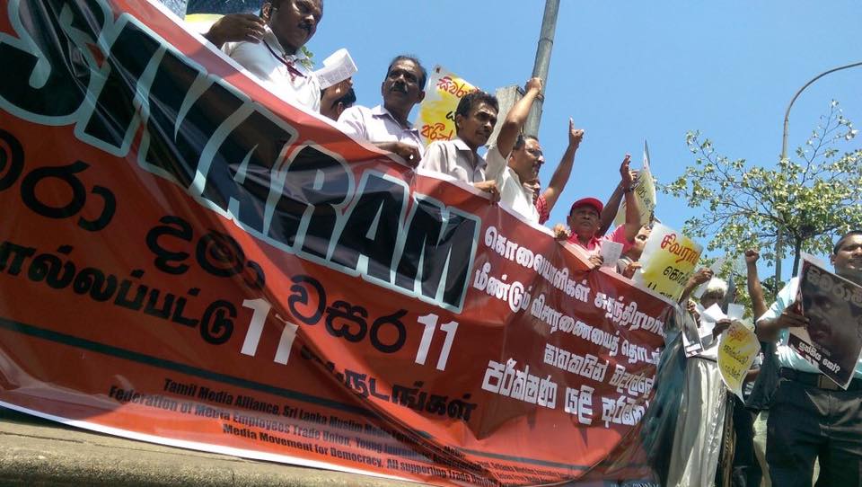 sivaram-memo- (5)மூத்த ஊடகவியலாளர் டி.சிவராம் படுகொலை செய்யப்பட்டு நேற்றுடன் 11 ஆண்டுகள் நிறைவடைந்த நிலையில், ஊடகவியலாளர்கள் படுகொலைகளுக்கு நீதி வழங்கக் கோரி கொழும்பில் நேற்று ஆர்ப்பாட்டம் ஒன்று மேற்கொள்ளப்பட்டது.