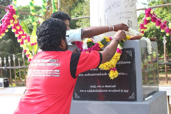 யாழ்ப்பாணத்தில் அமைக்கப்பட்டுள்ள, படுகொலையான ஊடகவியலாளர்களின் நினைவிடத்தில் நேற்றுப் பிற்பகல், நினைவுச்சுடர் ஏற்றப்பட்டு, மலரஞ்சலி செலுத்தப்பட்டது.