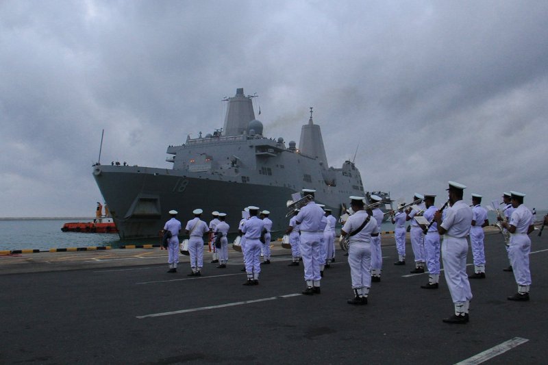 அமெரிக்கப் போர்க்கப்பலுக்கு சிறிலங்கா கடற்படையினர் பாரம்பரிய முறைப்படி வரவேற்பு அளித்தனர்.