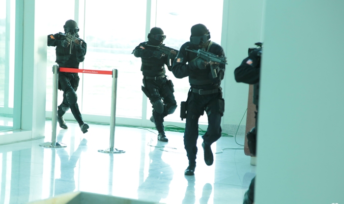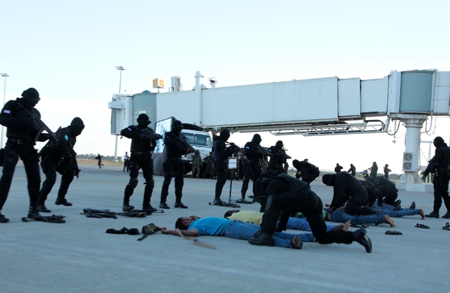 விமானத்துக்குள் இருந்தும், விமான நிலையக் கட்டடத்துக்குள் இருந்தும், பணயக் கைதிகளை மீட்கும் வகையில் இந்த ஒத்திகைப் பயிற்சி மேற்கொள்ளப்பட்டது.