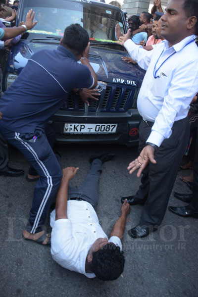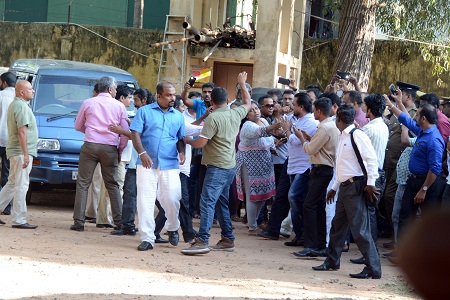அத்துடன் காவல்துறை வாகனம் மீது தாக்கியும், அதன் முன்னால் நிலத்தில் படுத்திருந்தும் நீதிமன்றத்துக்கு கொண்டு செல்ல விடாமல் தடுக்க முயன்றனர். இதனால் சற்று பதற்றநிலை காணப்பட்டமை குறிப்பிடத்தக்கது.