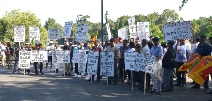 போர்க்குற்றவாளிகளை கௌரவிக்காதே உள்ளிட்ட பல்வேறு வாக்கியங்கள் எழுதப்பட்ட அட்டைகளுடன், புலம் பெயர் தமிழர்கள் தனியாக எதிர்ப்புப் போராட்டத்தில் ஈடுபட்டிருந்தனர். அவர்கள் புலிக்கொடியையும் ஏந்திருந்தனர்.