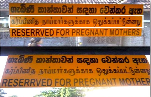 அத்துடன் அரச அலுவலகங்களில் காட்சிப்படுத்தப்பட்டுள்ள அறிவுறுத்தல்களிலும் மொழி ரீதியான வழுக்கள் காணப்படுகின்றன. அரச அலுவலகம் ஒன்றில் சிங்களத்தில் எழுதப்பட்ட அறிவுறுத்தல் பலகையில் ‘இது கர்ப்பிணித் தாய்மார்களுக்காக ஒதுக்கப்பட்டுள்ளது’ என எழுதப்பட்டுள்ளது. ஆனால் அதே அலுவலகத்தில் இந்த அறிவுறுத்தலானது ‘இது கர்ப்பிணி நாய்மார்களுக்காக ஒதுக்கப்பட்டுள்ளது’ என தமிழில் தவறாக மொழிபெயர்க்கப்பட்டுள்ளது என அமைச்சர் மனோ கணேசன் குறிப்பிட்டார்.
