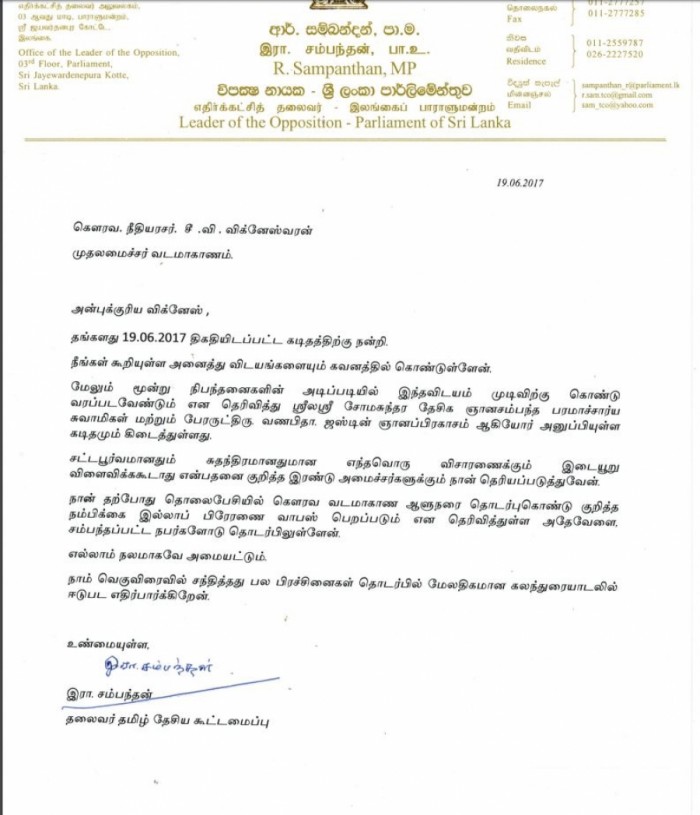நம்பிக்கையில்லாப் பிரேரணை மீளப் பெறப்படும் – விக்னேஸ்வரனுக்கு சம்பந்தன் கடிதம்