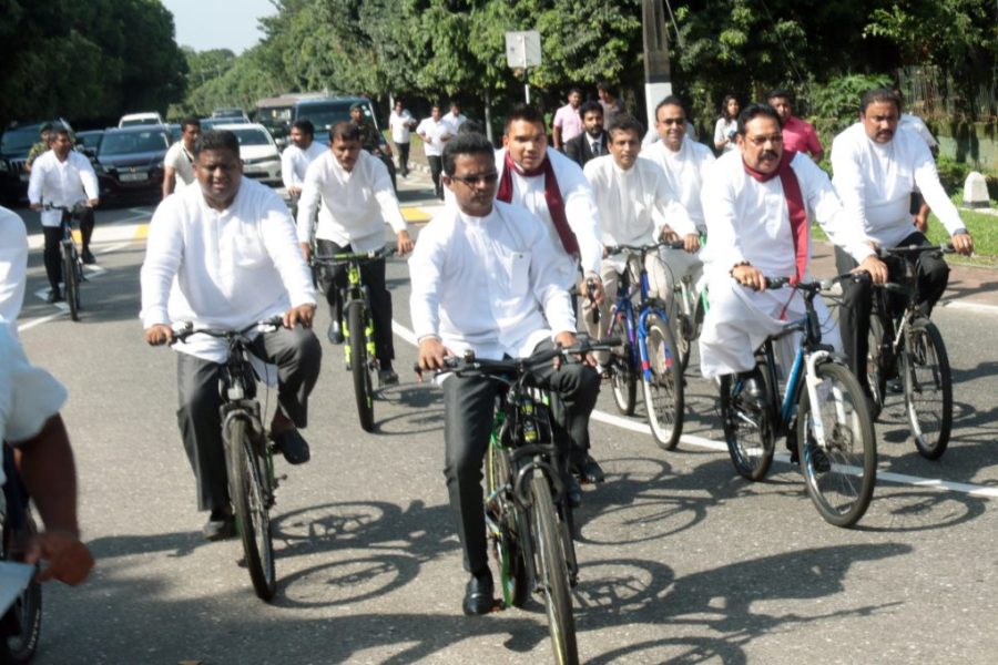 மகிந்த ராஜபக்ச உள்ளிட்ட நாடாளுமன்ற உறுப்பினர்கள் மிதிவண்டியில் வந்த போது, அவர்களின் பாதுகாவலர்கள் அவர்களுக்குப் பின்னால் ஒடிவந்து கொண்டிருந்தனர்.