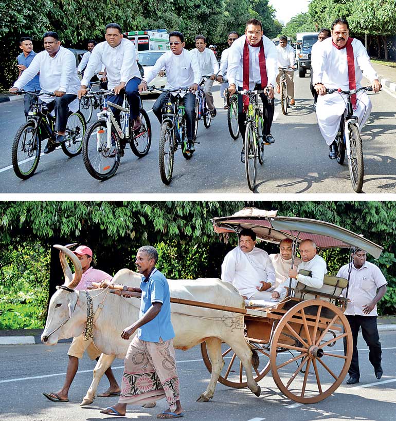 நாடாளுமன்றத்தில் நேற்று பிற்பகல் இடம்பெற்ற வரவுசெலவுத் திட்ட உரையில் பங்கேற்பதற்காக, மகிந்த ராஜபக்ச, நாமல் ராஜபக்ச உள்ளிட்ட சில நாடாளுமன்ற உறுப்பினர்கள் மிதிவண்டியில் வந்தனர். தினேஸ் குணவர்த்தன மாட்டு வண்டியில் வந்தார்.