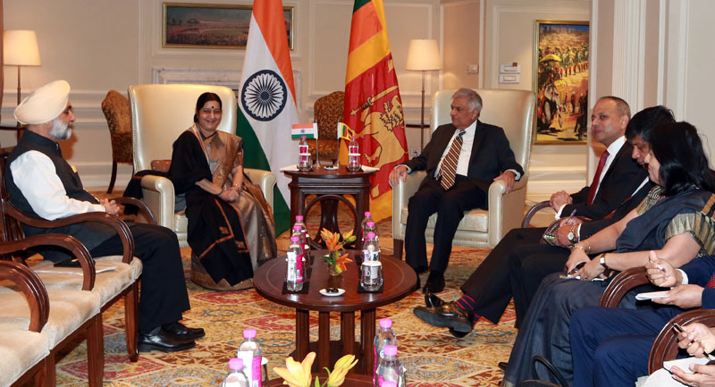 சிறிலங்கா பிரதமர் ரணில் விக்கிரமசிங்கவை, இந்திய வெளிவிவகார அமைச்சர் சுஸ்மா சுவராஜ் சந்தித்துப் பேச்சு நடத்தியுள்ளார்.