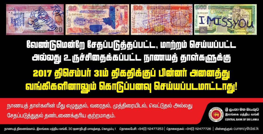 sri lanka rupeeஎழுதுகருவிகளினால் கிறுக்கப்பட்ட, வேண்டுமென்றே சேதப்படுத்தப்பட்ட, மாற்றம் செய்யப்பட்ட, அல்லது உருச்சிதைக்கப்பட்ட நாணயத்தாள்கள், வரும் டிசெம்பர் 31ஆம் நாளுக்குப் பின்னர் செல்லுபடியாகாது என்று சிறிலங்கா மத்திய வங்கி அறிவித்துள்ளது.