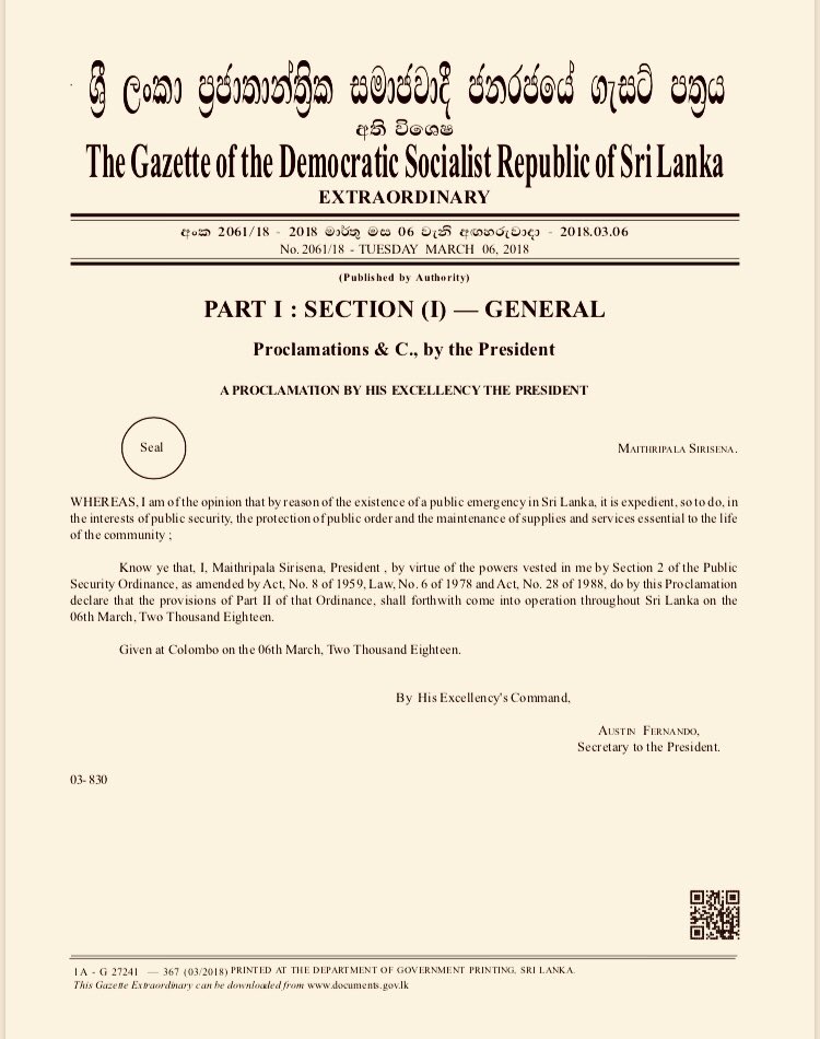 நாட்டின் சில பகுதிகளில் நிலவும் அசாதாரண நிலைமைகளை கட்டுப்பாட்டிற்குள் கொண்டு வருவதற்காக சிறிலங்கா அதிபர் மைத்திரிபால சிறிசேனவினால் அவசரகால சட்டம் பிரகடனப்படுத்தப்பட்டுள்ளதாக அதிபரின் ஊடகப் பிரிவு தெரிவித்துள்ளது.