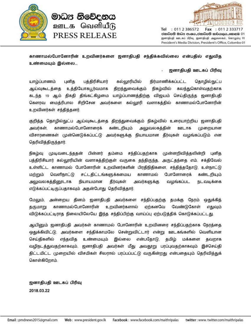 யாழ்ப்பாணத்துக்குப் பயணம் மேற்கொண்டிருந்த போது, சிறிலங்கா அதிபர் மைத்திரிபால சிறிசேன, காணாமல் ஆக்கப்பட்டோரின் உறவினர்களைச் சந்திக்க மறுத்து விட்டார் என்று வெளியான செய்திகளை சிறிலங்கா அதிபரின் ஊடகப் பிரிவு ஆதாரங்களுடன் மறுத்துள்ளது.