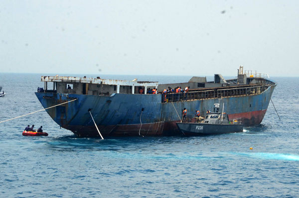 களிடம் இருந்து கைப்பற்றப்பட்ட கப்பல் ஒன்றை சிறிலங்கா கடற்படையினர் நேற்று நீர்கொழும்புக்கு அப்பால் உள்ள ஆழ்கடலில் மூழ்கடித்தனர்.