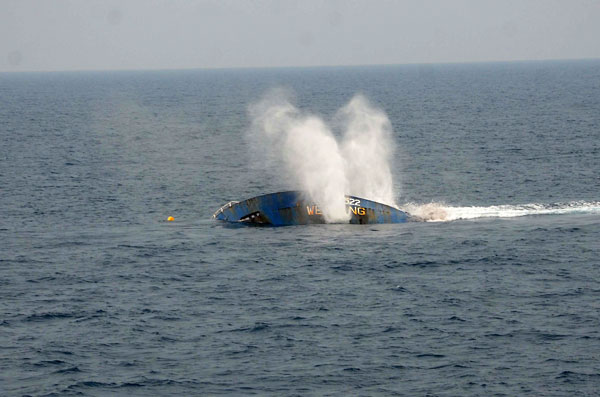 இதனால், சிறிலங்கா அரசின் அனுமதியுடன் இந்தக் கப்பல் சிறிலங்கா கடற்படையினரால், ஆழ்கடலுக்கு இழுத்துச் செல்லப்பட்டு கடலில் மூழ்கடிக்கப்பட்டது.