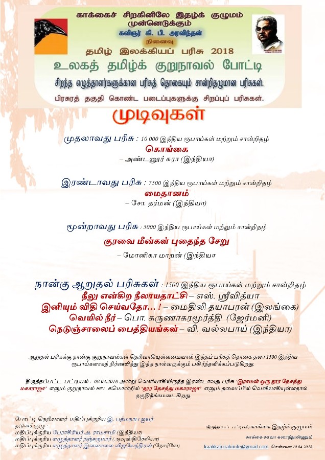 கவிஞர் கி.பி.அரவிந்தன் நினைவு இலக்கியப் பரிசு : ‘உலகத் தமிழ்க் குறுநாவல் போட்டி 2018’ – முடிவுகள்