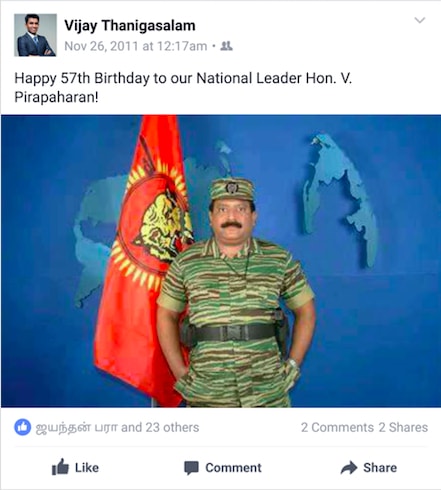 2011ஆம் ஆண்டு, விஜய் தணிகாசம், “எமது தேசியத் தலைவருக்கு 57 ஆவது இனிய பிறந்த நாள் ” என்று குறிப்பிட்டு, சீருடையணிந்த பிரபாகரனின் படத்தை வெளியிட்டிருந்தார்.