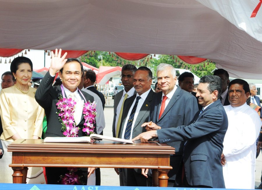 தனி விமானத்தில் இன்று பிற்பகல் கட்டுநாயக்க விமான நிலையத்தை வந்தடைந்த தாய்லாந்து பிரதமரை, சிறிலங்கா பிரதமர் ரணில் விக்கிரமசிங்க நேரில் சென்று வரவேற்றார்.