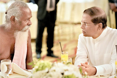 மைத்திரிபால சிறிசேன மற்றும் மகிந்த ராஜபக்சவின் தனிப்பட்ட பாதுகாவலர்களின் கவனம், வேடுவர் தலைவரின் மீதே இருந்தது. அவர் பாரம்பரிய முறைப்படி தனது தோளில் கோடரியை கொளுவியிருந்தார்.