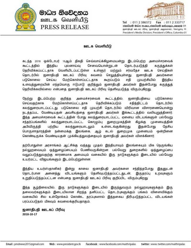 தன்னைப் படுகொலை செய்யும் சதித் திட்டத்தின் பின்னணியில், இந்தியப் புலனாய்வு அமைப்பான ‘றோ’ இருந்தது என்று சிறிலங்கா அதிபர் மைத்திரிபால சிறிசேன அமைச்சரவைக் கூட்டத்தில் கூறியதாக வெளியான செய்திகளை அடுத்து, நேற்றுமாலை சிறிலங்கா அதிபரின் ஊடகப் பிரிவினால் இந்த அறிக்கை வெளியிடப்பட்டுள்ளது.