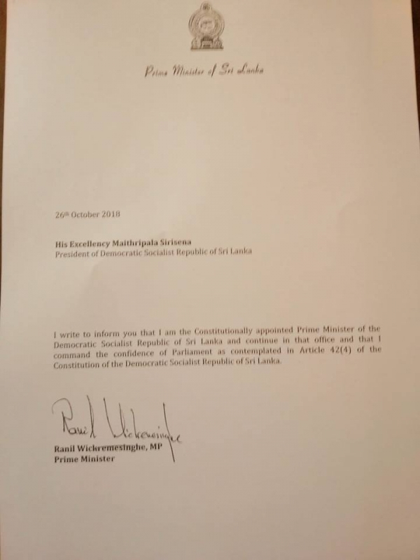 அதில்,“ சிறிலங்கா அரசியலமைப்பின் படி நியமிக்கப்பட்ட பிரதமர் நானே என்பதை உங்களுக்கு தெரியப்படுத்துகிறேன். தொடர்ந்தும் பதவியில் இருக்கிறேன். அரசியலமைப்பின் (42)4 பிரிவின் கீழ், நாடாளுமன்றத்தில் பெரும்பான்மை ஆதரவைக் கொண்டிருக்கிறேன்” என்று கூறப்பட்டுள்ளது.