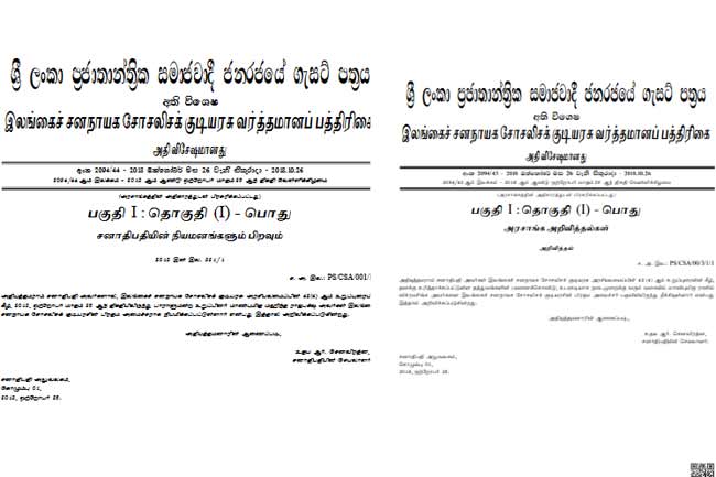 சிறிலங்கா அதிபர் மைத்திரிபால சிறிசேனவின் உத்தரவின் பேரில், இந்த அரசிதழ் அறிவிப்புக்களை, அவரது செயலர் உதய செனிவிரத்ன இன்று அதிகாலை வெளியிட்டுள்ளார்.