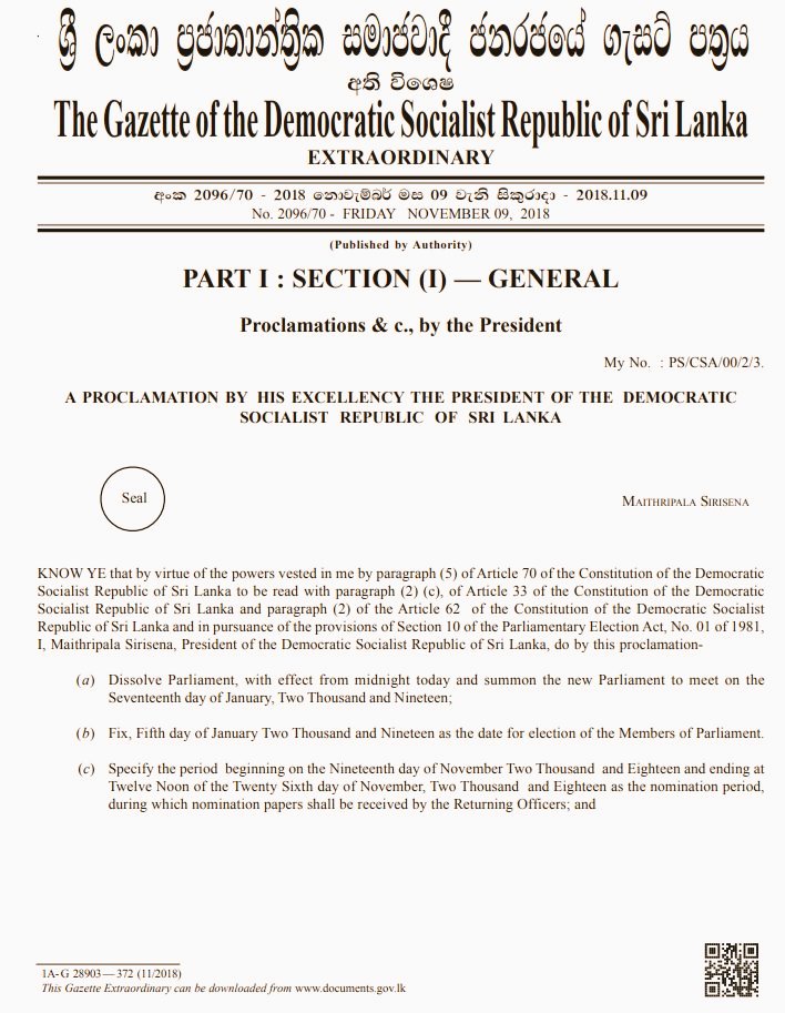 சிறிலங்கா நாடாளுமன்றம் இன்று நள்ளிரவு கலைக்கப்படுவதாகவும்,  2019 ஜனவரி 05ஆம் நாள் தேர்தல் நடத்தப்படும் என்றும் சிறிலங்கா அதிபர் அறிவித்துள்ளார். இதுதொடர்பான அரசிதழ் அறிவிப்பு இன்று  இரவு வெளியிடப்பட்டுள்ளது.