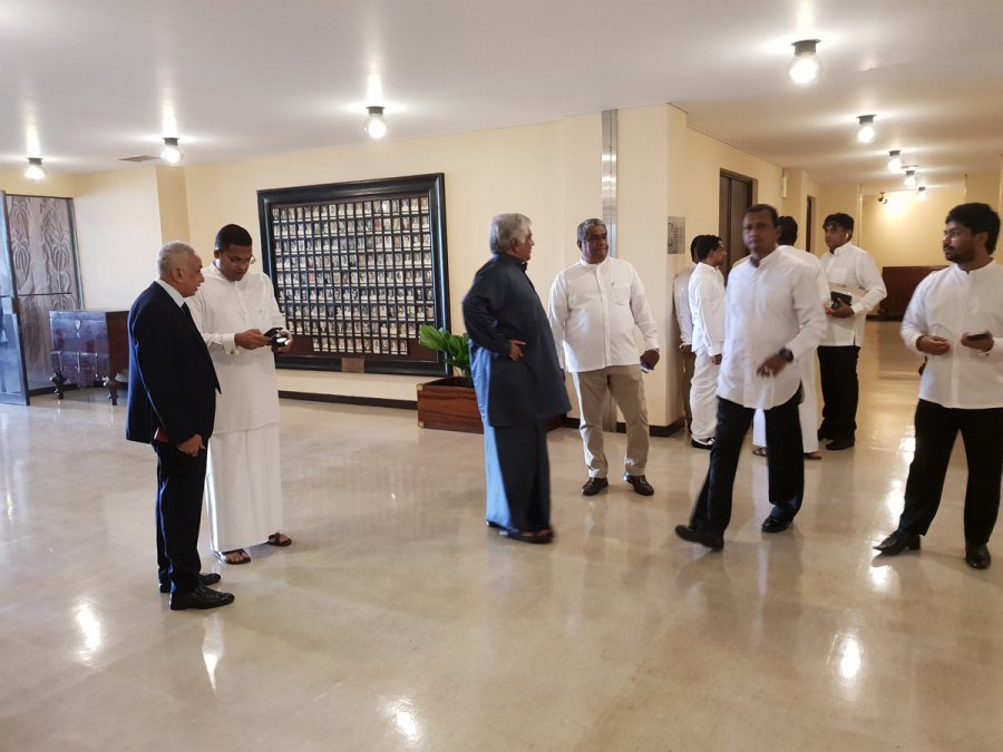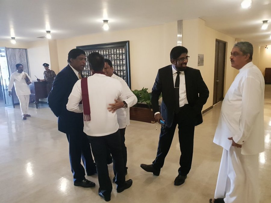 ஐதேகவின் முன்னாள் அமைச்சர் மலிக் சமரவிக்ரமவும், சிறிலங்கா சுதந்திரக் கட்சியின் அமைச்சர் நிமல் சிறிபால டி சில்வாவும் கட்டியணைத்து சிரித்தடி உரையாடிக் கொண்டிருந்தனர்.