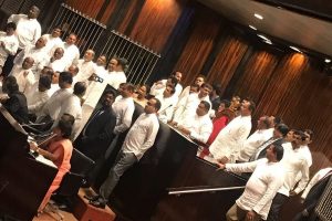 மகிந்த ராஜபக்ச இன்னமும் அவைக்கு வராத போதும், நாமல் ராஜபக்ச சபா மண்டபத்தில் நிலைமைகளைப் பார்வையிட்டுக் கொண்டிருக்கிறார்.