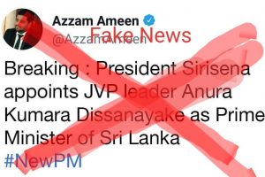 சிறிலங்கா பிரதமராக அனுரகுமார திசநாயக்கவை, அதிபர் மைத்திரிபால சிறிசேன நியமித்துள்ளார் என்று நேற்றிரவு சமூக வலைத்தளங்களில் பரவிய போலிச் செய்தியால் குழப்பம் ஏற்பட்டது.