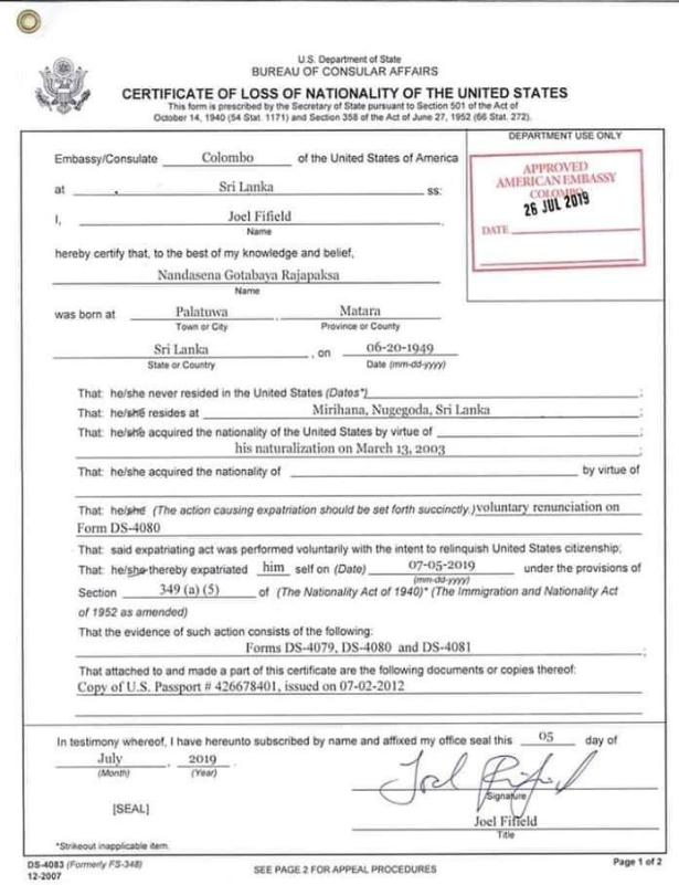 அந்த சான்றிதழில், கோத்தாபய ராஜபக்ச, 2003 மார்ச் 13ஆம் நாள் அமெரிக்க குடியுரிமையைப் பெற்றதாகவும், 2019 ஜூலை 05ஆஆம் நாள் அமெரிக்க தூதரகத்தில் தனது அமெரிக்க குடியுரிமையை கைவிட்டார் எனவும், குறிப்பிடப்பட்டுள்ளது,