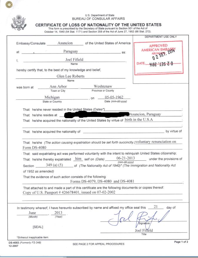 அமெரிக்க குடியுரிமையை இழப்பது தொடர்பாக அளிக்கப்பட்ட சான்றிதழ். போல, வடிவமைக்கப்பட்ட இந்த ஆவணம், சமூக ஊடகங்களில் இன்று காலையில் இருந்து உலா வந்து கொண்டிருக்கிறது.