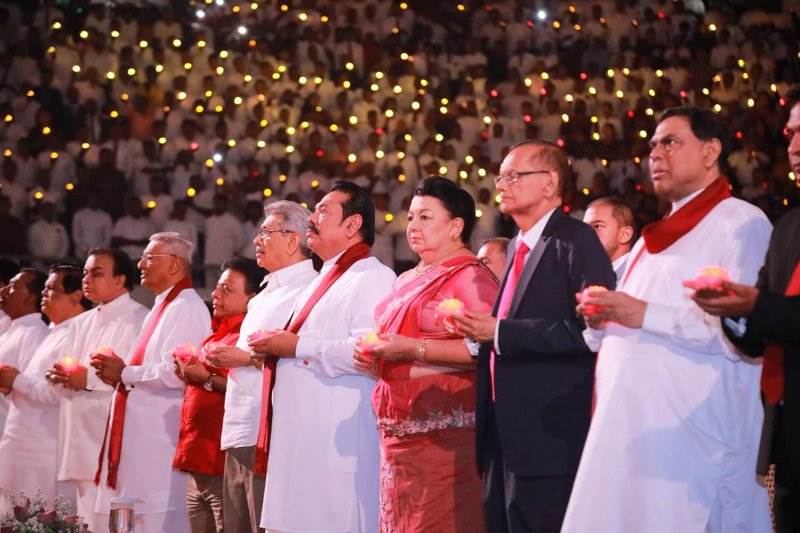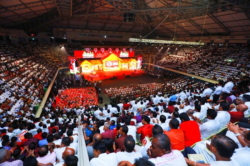 அப்போது, திடீரென மாநாட்டில் பங்கேற்றிருந்தவர்கள் ஒரே நேரத்தில் பெரும் கரகோசம் எழுப்பி, கோத்தாபய ராஜபக்சவின் படங்களை உயர்த்திப் பிடித்தனர்.